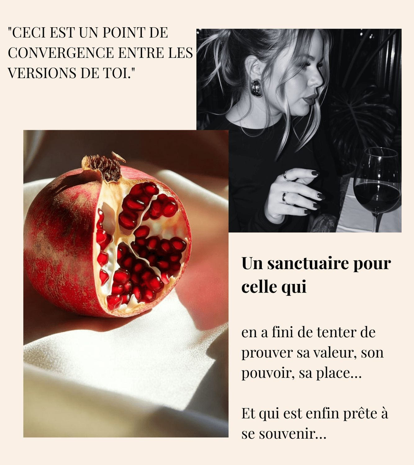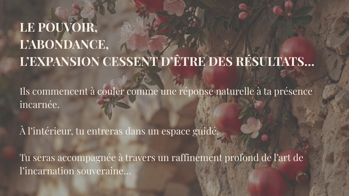 Un espace où tu descends dans ton corps pour transmuter la honte et les blessures qui te retiennent, reconnecter à ton féminin sacré et à ton cycle, et incarner pleinement la femme que tu es destinée à être.